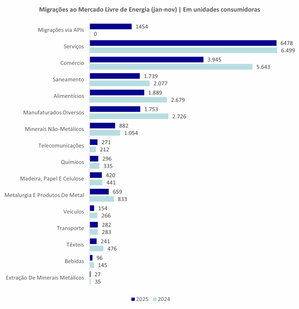 Empresas ligadas ao setor de Serviços foram as que mais aderiram ao mercado livre, com 6.478 novas unidades consumidoras entre janeiro e novembro deste ano, seguidas pelo ramo de Comércio (3.945). São duas áreas que, no total, têm a maior representatividade no ambiente em função da capilaridade de negócios. No momento, a análise por ramos não considera os consumidores que, a partir de julho deste ano, passaram a migrar pelo novo modelo de cadastro e gerenciamento via APIs da CCEE.